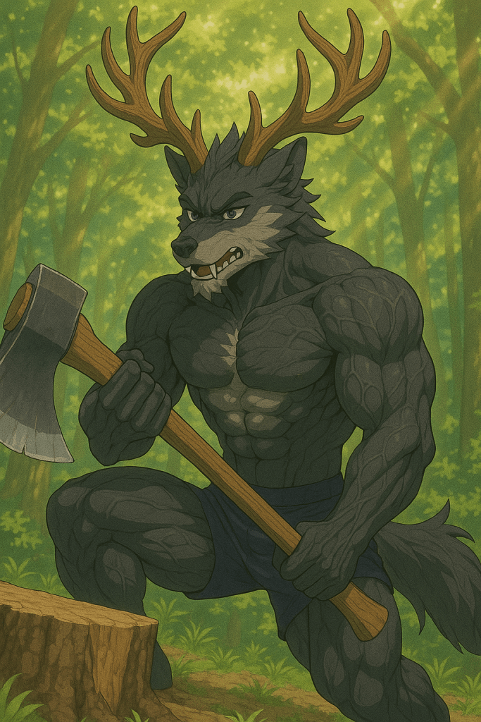 Wolfoshi, torse nu, un petit short moulant bleu nuit serré autour de ses cuisses puissantes, abattait méthodiquement des bûches avec une vieille hache en acier trempé. Ses bras veineux, ses épaules sculptées, vibraient à chaque impact. Il travaillait en rythme, concentré, l’air grave. Derrière lui, la forêt semblait respirer avec lui.