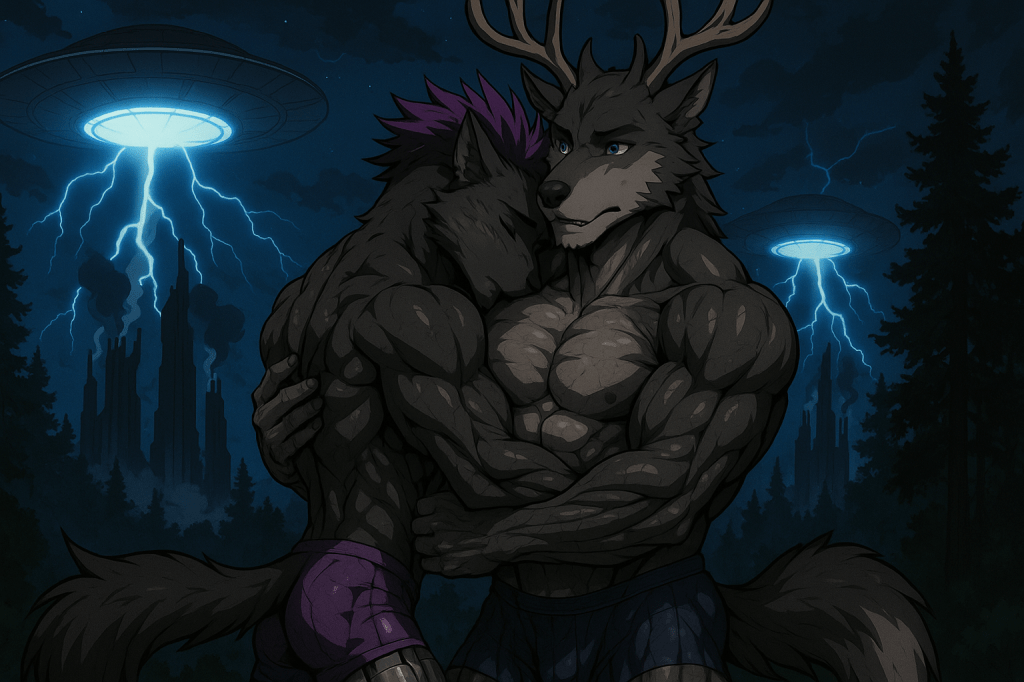Wolfoshi le regarda avec une douceur qui tranchait avec la gravité de la situation. D’un geste calme, il entoura MrKnowherre de ses bras puissants. Son étreinte était chaude, rassurante, ferme. MrKnowherre enfouit son visage contre le cou de son compagnon, respirant profondément son odeur familière. Les crocs de Wolfoshi luisaient sous la lumière surnaturelle, mais ses yeux bleus, eux, ne reflétaient que tendresse.