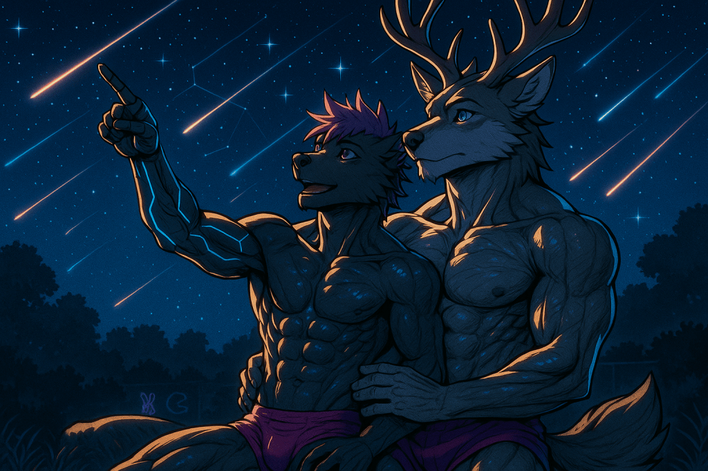 Un silence tendre s’installa, seulement troublé par le chant lointain d’une chouette. Wolfoshi passa un bras autour de MrKnowherre, qui se blottit un peu plus contre lui. Soudain, une première traînée de lumière traversa le ciel… puis une deuxième… puis des dizaines.