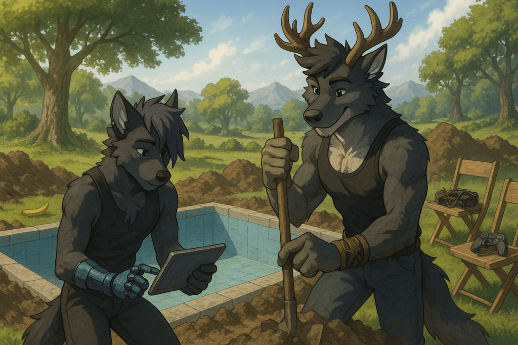 Wolfoshi, torse nu, les muscles saillant sous la lumière printanière, maniait la pelle avec assurance. Sa chemise à carreaux bleue était négligemment posée sur le dossier d’un transat. MrKnowherre, plus fin mais tout aussi volontaire, portait son débardeur noir aux accents cyberpunk violets qui scintillaient légèrement à la lumière. Sa prothèse cybernétique cliquetait doucement à chaque mouvement tandis qu’il mesurait, creusait, vérifiait les plans sur une tablette.