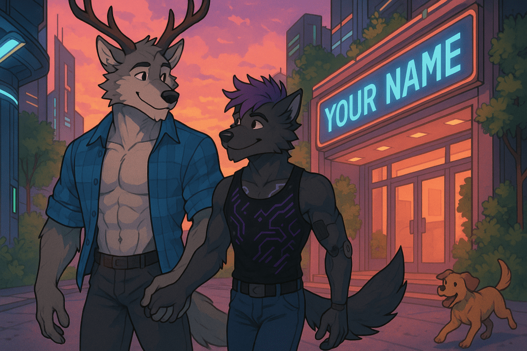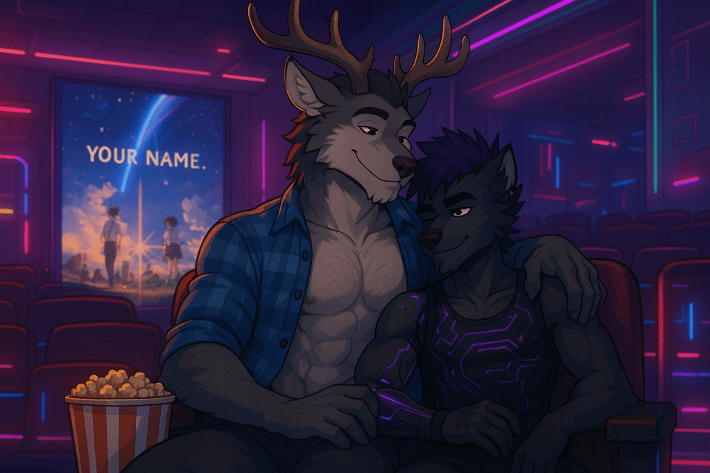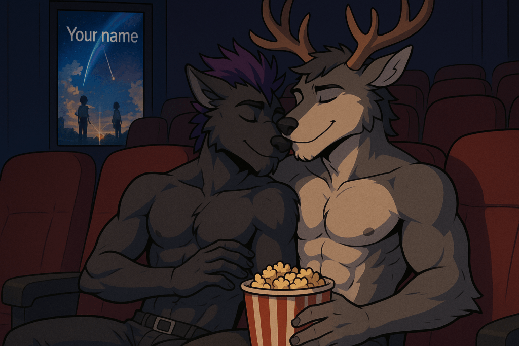 C’était une fin d’après-midi tranquille, baignée d’un ciel rosé. MrKnowherre et Wolfoshi marchaient côte à côte, leurs doigts s’effleurant parfois, jusqu’à finir naturellement enlacés. Ils allaient au cinéma du centre-ville, une petite salle rétro avec des fauteuils rouges moelleux et des murs tapissés d’affiches anciennes. Ce soir, ils allaient voir Your Name, un film que MrKnowherre rêvait de découvrir depuis longtemps. Wolfoshi, lui, l’avait déjà vu, mais il adorait regarder les émotions de son compagnon pendant une première fois.