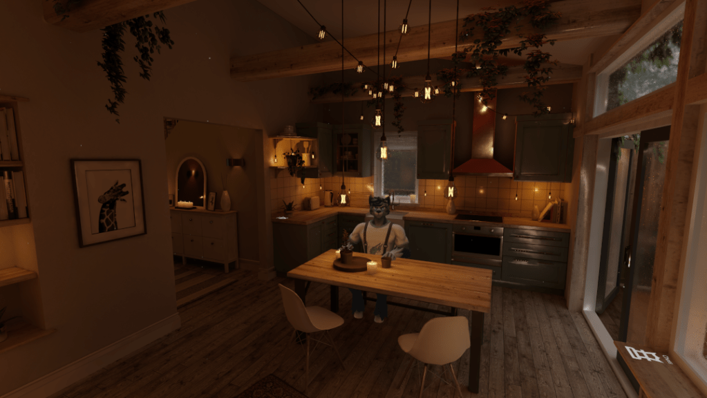 A warm inviting home with plenty of comfortable spots set in a rainy neighborhood. #VR #VRChat #VRChatPhotography #VRChat_World #vrexplorer #MadeWithVRChat
