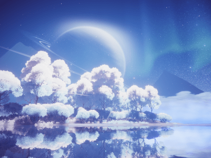 138作目は美しい鏡の湖。雪景色の中にそびえるクリスタルを守る大樹が神秘的です。The 138th world is a beautiful mirror lake․ The large tree towering over the snowy landscape that protects the crystal is mysterious․